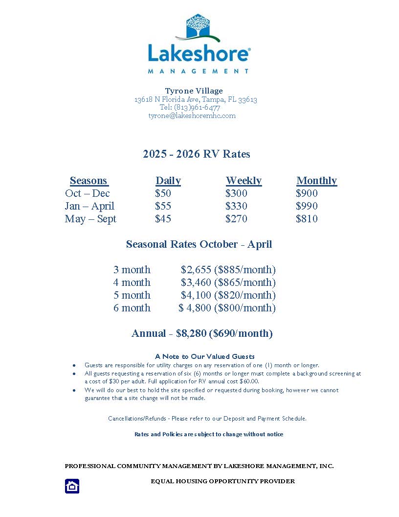 All RV’s must have self-contained sanitary facilities. We are committed to maintaining a clean and healthy environment for our residents and we request that our tenants, homeowners and visitors assist in keeping this commitment.